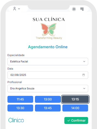 Seus pacientes podem marcar horários diretamente pelo celular ou computador, sem depender da recepção.