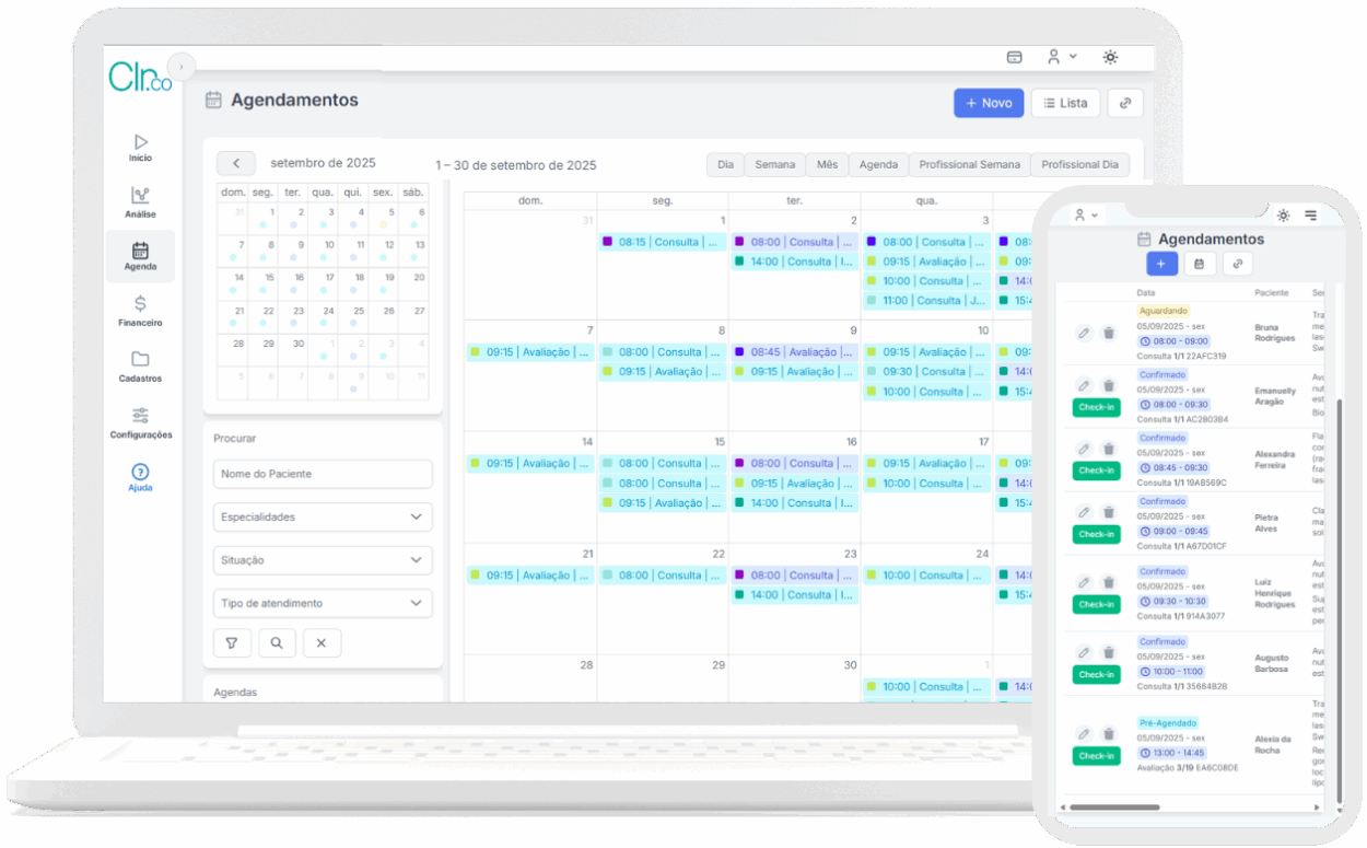 Clínico é um sistema completo para clínicas de estética que vai além da gestão tradicional. Organiza sua agenda, prontuários e atendimentos, enquanto tem clareza financeira real sobre a rentabilidade de cada tratamento, equipamento e locação.