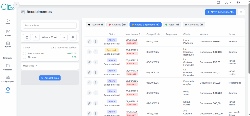 Veja na coluna lateral filtros rápidos para buscar o cliente, data, conta bancária.