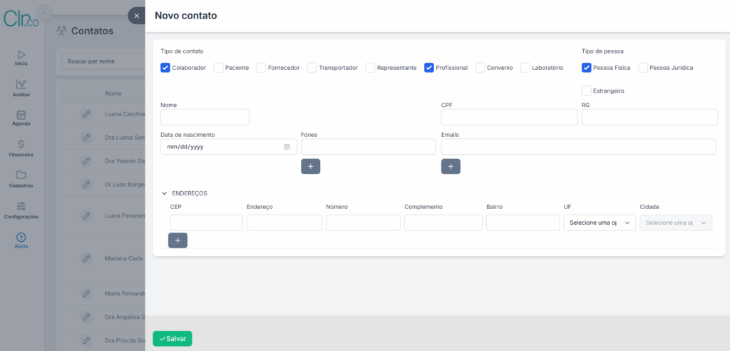 Selecione principalmente os Tipos do Contato (Colaborador, Paciente, Fornecedor, Transportador, Representante, Profissional, Convênio ou Laboratório).